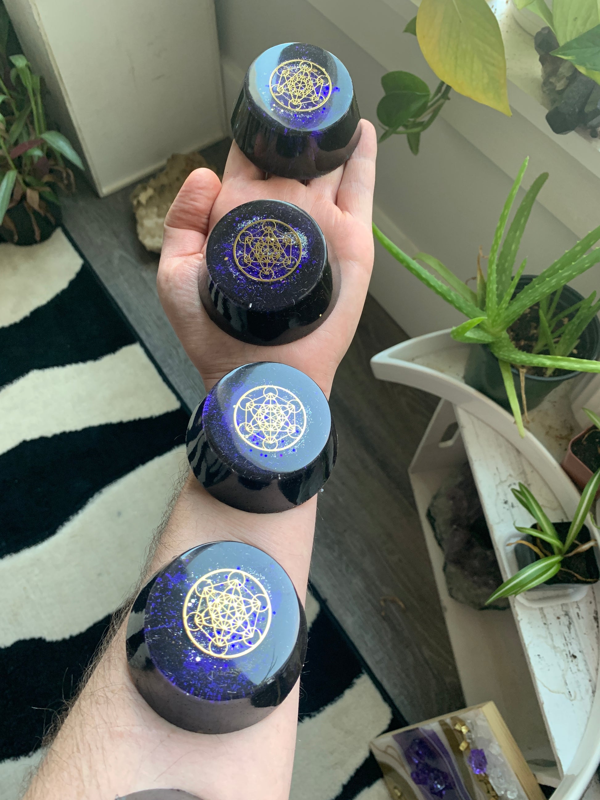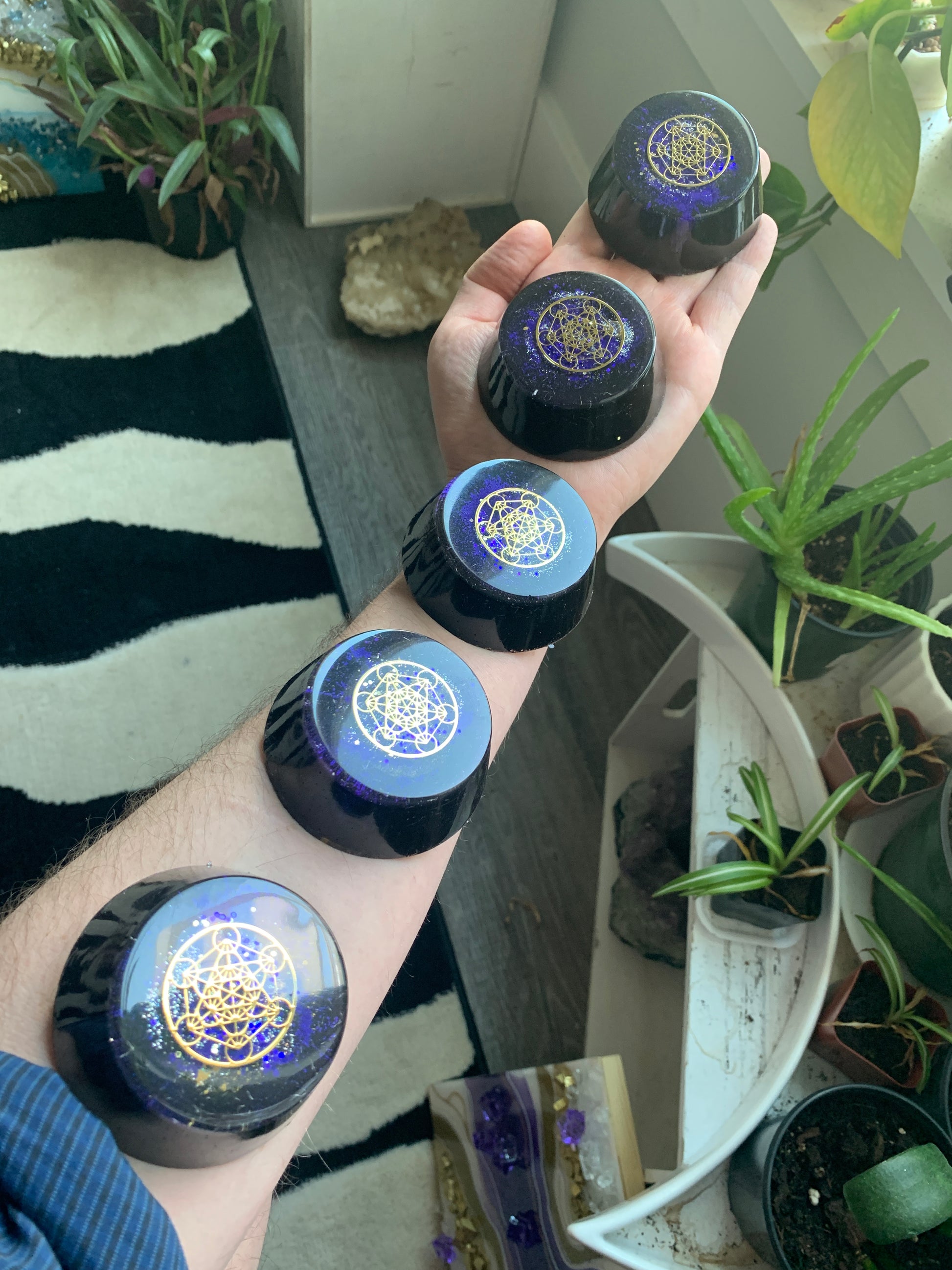 Each piece features a golden metatron's cube with gorgeous splashes of purple colors made with mica powders and a bit of holographic glitters.Tower Busters are known as the work horses of orgonite.