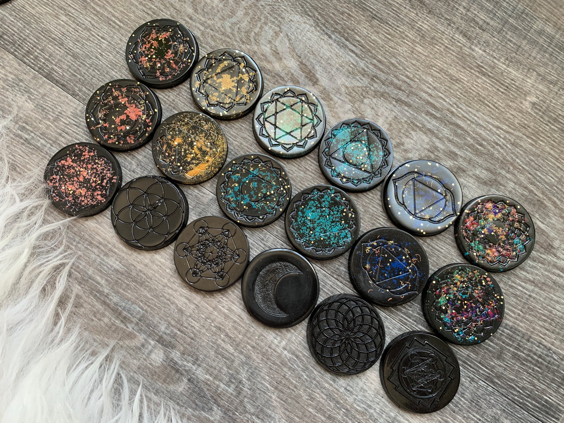 SPECIFIC NOTES: Several styles available. None of the edges will be sanded. Various imperfections throughout lot. Black seed of Life and Black Metatron both have rough dried drips.