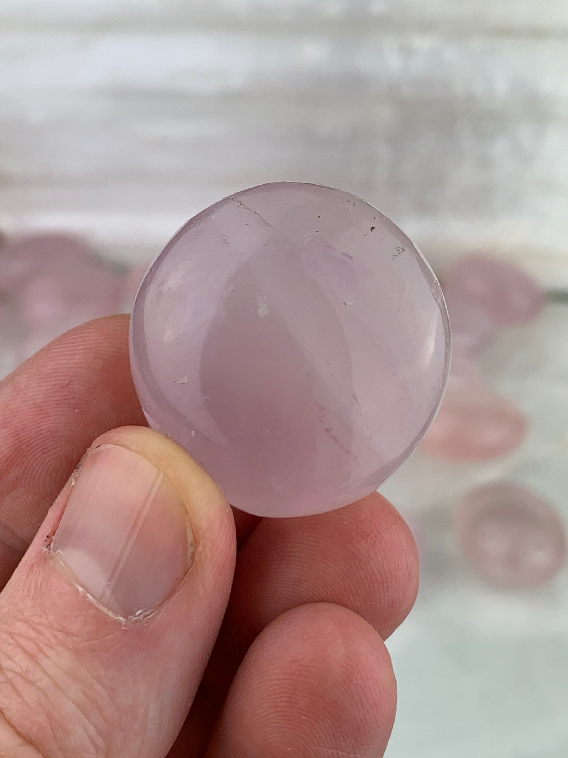 Beautiful soft pinks with gentle white banding. Some are lighter, some are deeper pink. Perfect size palm stone. Large enough provide really nice energy, but not super heavy.