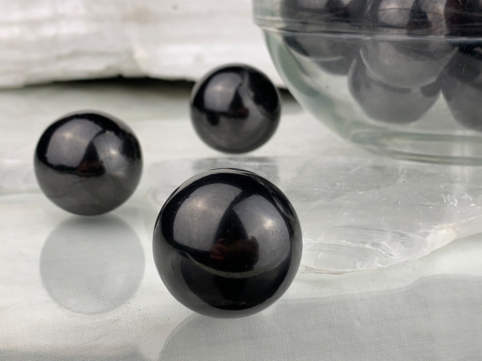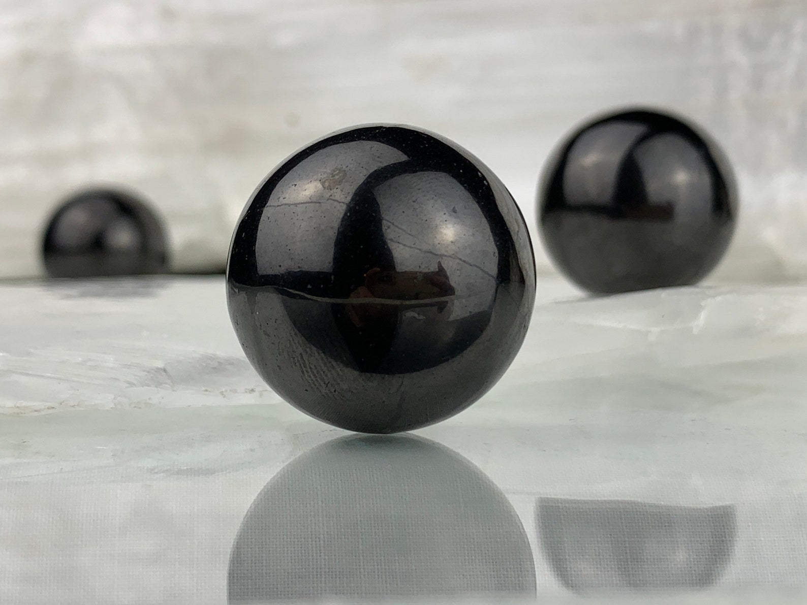 These Russian shungite spheres are very special. Deep silvery black / gray, some with gentle gray banding and a high gloss polish. Shungite is well known for its ability to cleanse water and help protect against EMFs.